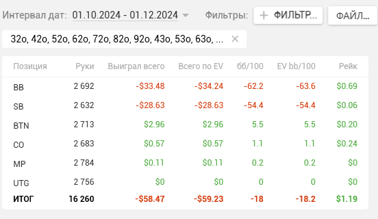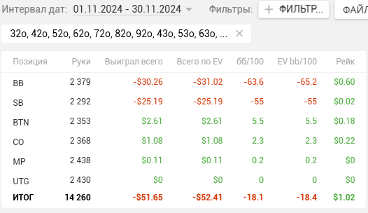 наиграно более 55 000 рук. Результат положительный, по EV скорее хороший, особенно учитывая мой старый стиль и изучение текущей меты. Хотя не исключён и upstrick. На блайдах вполне достойно, да и в целом, доходность позиций нормальная.