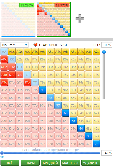 В старом стиле при выборе активности на префлопе между 76s и A2s однозначно выбирал первую, но текущий анализ и солверы заставили таки понять что такое блокеры и скорректировать игру. Однако об это с следующих постах. Ужасно защищаю большой блайд. Ещё хуже играю SB vs BB, тут необходимо будет поиграться с текущим софтом для моделирования типовых линий. Изучить полярные 3-bet в этой игре.