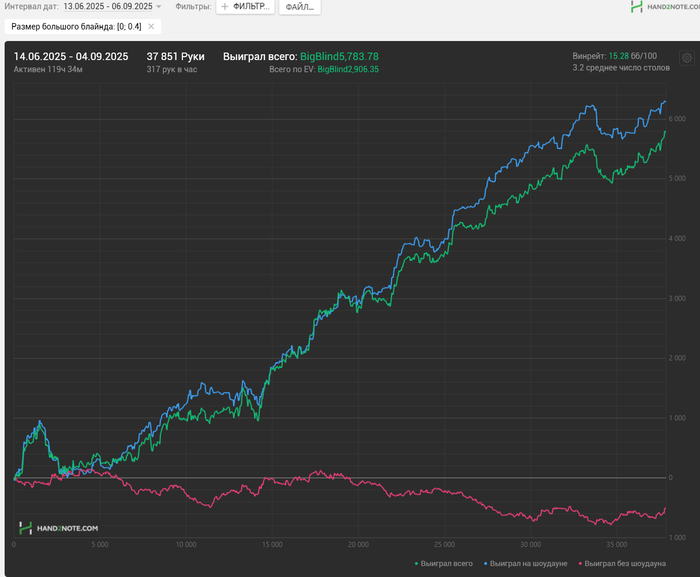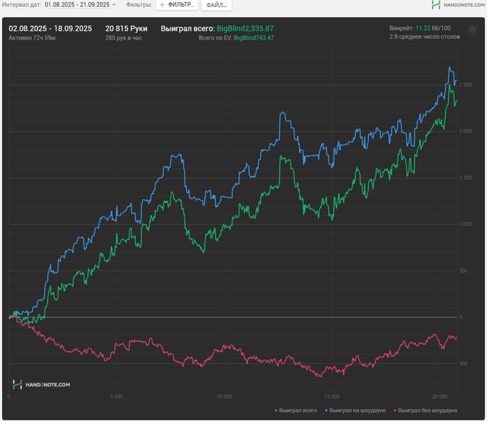 На тот момент я играл NL10 в слабый плюс, а NL25 — в ноль или в минус. После работы с ним (примерно 3–4 месяца, с учётом моей загруженности) ситуация изменилась кардинально: NL10 прошёл с уверенным двузначным винрейтом, NL25 — тоже уверенно в плюс (7–8 ев\бб). Сейчас уже начал шотить NL50.