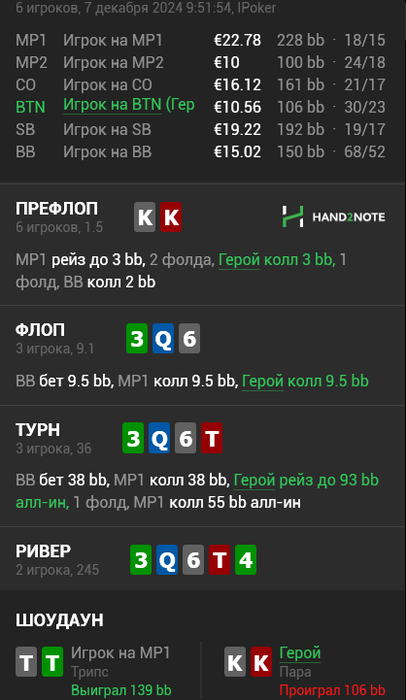 q_game, С АК и QQ играть нужно аккуратнее. Ты же смотри что ты с ранней опенишь, сб кол и бб как я понял рег вас сквизит. Пуш у тебя это оверплей! Будь позы поздние то ок. Я бы дал 4бет 28бб гдето (до 30бб у нас есть префлоп фолд) и если ББ нитовый с высокими фолдами и низкими сквизами пушнул я бы зарыл АК. Если хочешь кол то на таком постфлопе, да, фолд. Так же и в зеркальной ситуации. Пушить АК в раннюю это оверплей. Обращай внимание на позы и кто тебя "крутит". С фишом тут изи пуш. И ещё, делай скрины кто за столами, ато не видно впип.
