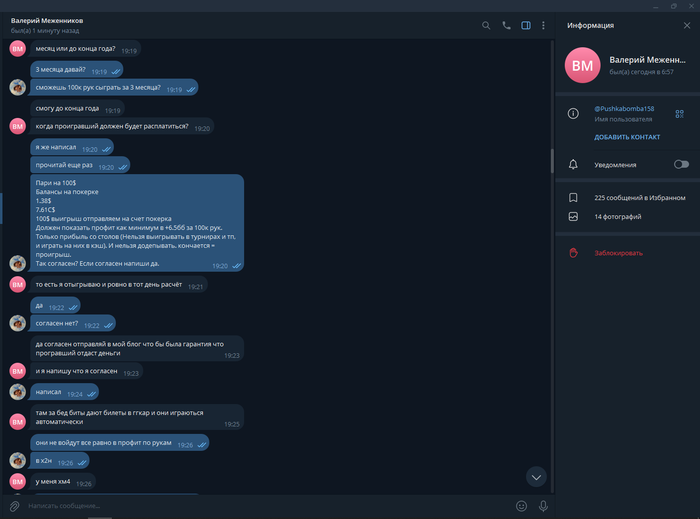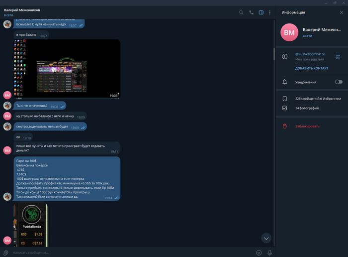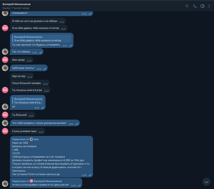 PushkaBombaPoker @ 10.12.24Я тебе скажу так, я не рабатаю на дядю и на гос работе уже около 7 лет и мной никто не командует, а ты от меня требуешь отчëты после каждой моей игровой сессии, сегодня ты это сделал в 6 утра и стал требовать кучу всего и был послан.