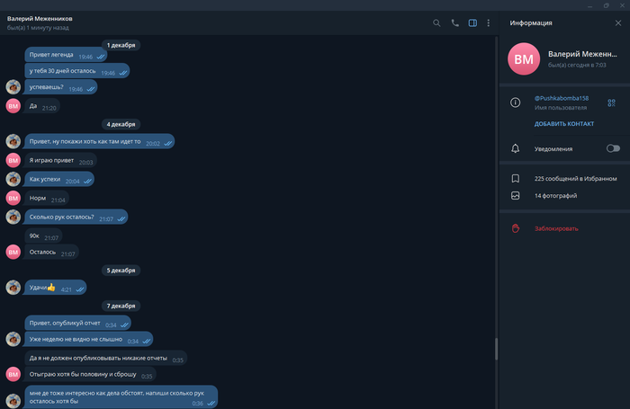 7 декабря прошу что бы он опубликовал отчет, на что получаю отказ в виде "откатаю половину и сброшу". И до 10 декабря затишье.