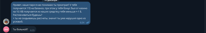 27 ноября скидывает скрин, где он выигрывает в фри спинах 10$, которые по условиям нашего пари не могут учавствовать (Только прибыль со столов, никаких бонусов). Ему так же об этом напомнил, никаких претензий не поступило.