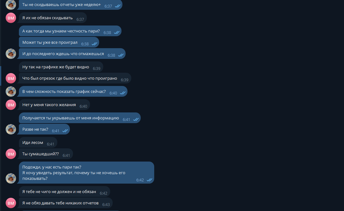 Следовательно, по моему мнению он меня вводит в заблуждение, тк я не получаю никакой информации по нашему пари, но вижу сомнительны марафоны в которых он сразу же делиться хоть чем-то (скрином с балансом).
