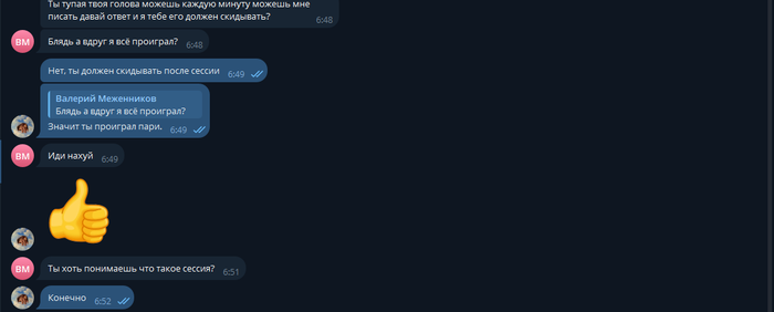 И я это пари с тобой разрываю сам, в одностороннем порядке потому что ты у себя в голове уже что-то придумал и деньги при проигрыше всë равно не отдаш. И ты специально мне постоянно пишешь и днëм и ночью и даже СУКА В 6 УТРА и постоянно трахаешь мне мозги.