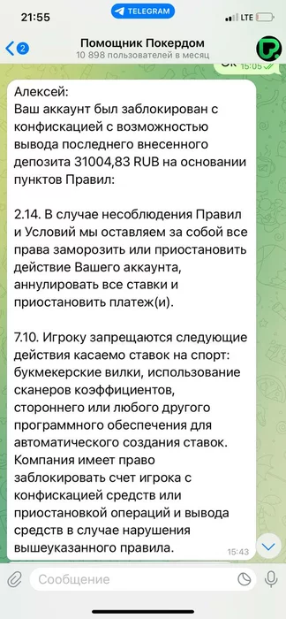 ПокердомКонсультант @ 13.12.24kudmnick, Добрый день. С момента последнего внесенного депозита со стороны провайдера sportsbook были зафиксированы множественные валуйные ставки на ивенты футбола. Согласно формулировке пп. 7.10 "Использование сканеров коэффициентов" подразумевает под собой целенаправленный поиск валуев. В данном случае, если бы с вашей стороны было зафиксировано однократное нарушение, можно было бы сетовать на ошибки на линии букмекера, и в таком случае санкции бы не применялись.