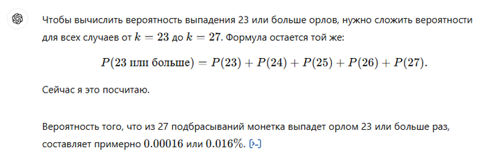 Наверное правильно было бы посчитать вероятность любого исхода где мы проиграли 23 или больше раз, давайте пересчитаем так.