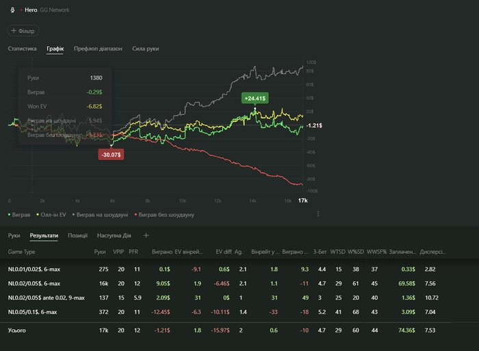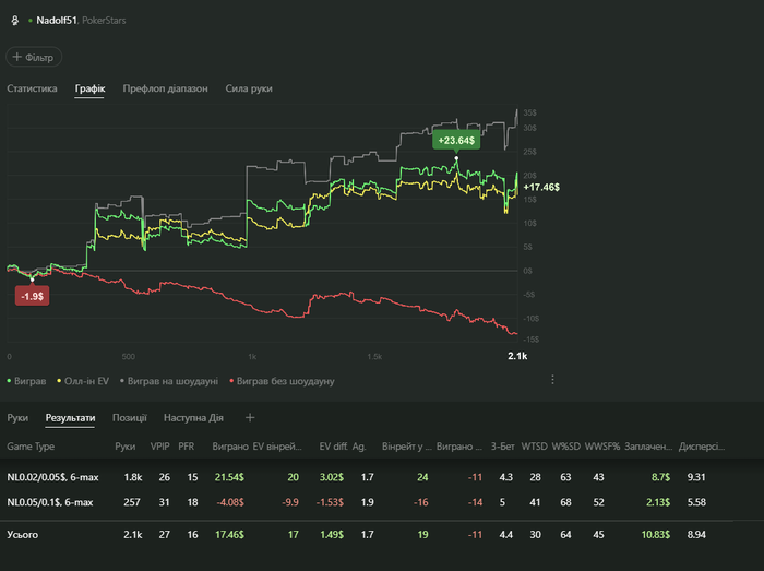 Здесь я впервую очередь не росказываю про свои, роздачи хотя такое тоже будет.Показываю результаты и хотелбы от более продвинутых игроков или игроков моих лимитов услышать результативные советы.Сам играю на старзах раньше пробовал ГГ но рейк там запредельный хоть и софт впереди планеты всей.Имею вот такие показатели если есть кто хочет помочь в розборе игры или что-то подобное пишите я с радостю пообщаюсь.