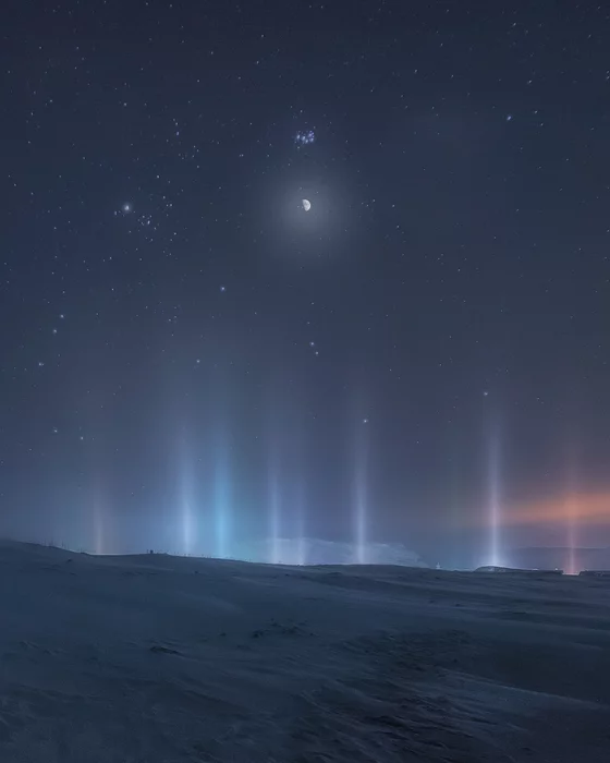 Световые столбы- это явление вызывается отражением света на почти горизонтальных плоских гранях шестиугольных плоских либо столбовидных ледяных кристаллов, взвешенных в воздухе. Кристаллы стремятся занять горизонтальную позицию при падении в воздухе, и вид светового столба зависит от их взаимного расположения. Такие кристаллы образуются в высоких перистых облаках, наиболее часто в перисто-слоистых. При низких температурах подобные кристаллы также могут образовываться и в более низких слоях атмосферы. Поэтому световые столбы чаще наблюдаются в холодное время года. При формировании светового столба свет отражается либо от нижней или верхней поверхности ледяной пластинки, либо от горизонтальных торцов или граней ледяного стержня.