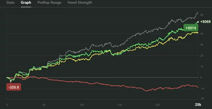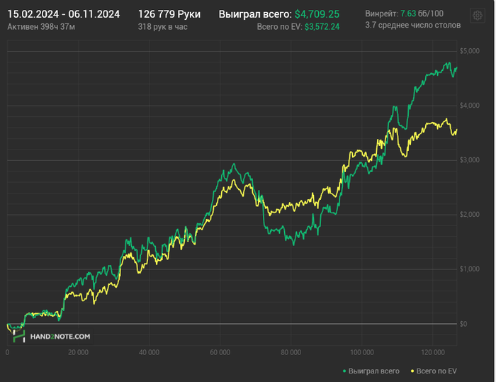 Провели вторую тренировку с Наилем,хотел бы показать графики,дистанция еще не большая,но изменения есть,знаю что дальше лучше будет,очень годную информацию преподносит,порой на не которые вещи, сам внимание не предаешь,но в покере очень много тонких моментов из чего строится винрейт,стараюсь еще переварить всю инфу и действовать по рекомендации тренера,хотел сказать Спасибо большое,что уделяешь мне столько времени и нервов своих 😄 В наше время очень трудно достичь хороших результатов (Если ты не гений) А благодаря Тренеру,возможно на много быстрее подняться на средние лимиты.