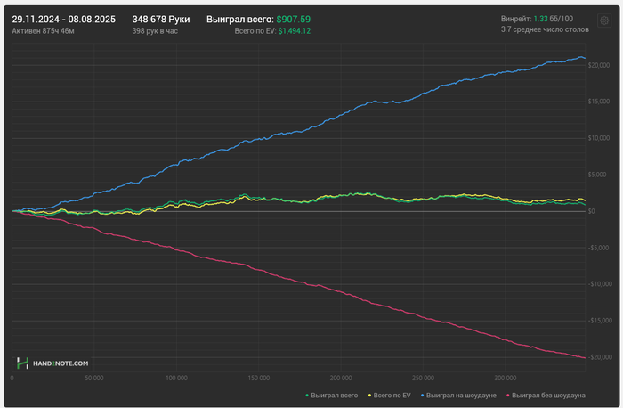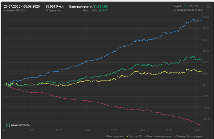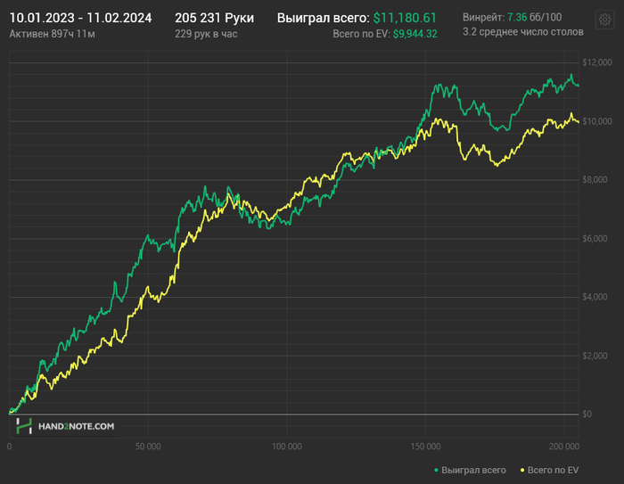 Тоже выложу свой свежий график, график в ББ лимиты 100-600 за последние 2 месяца в румах со статистикой, такие же примерно резы без статистики, 50к рук в общем за 2 месяца.