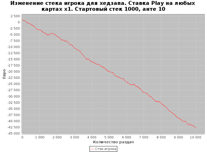 Первые результаты. Если мы будем все время на любых картах ставить одинаковые ставки в размере х1 на Ante, Blind, Play, то после 10000 раздач получим такие результаты. Явно минусовая игра. Завтра попробую какую-нибудь стратегию из интернета реализовать, может график поменяется как-то....во что я очень слабо верю. Больше всего забирает денег - невыплата Blind, когда мы выигрываем (Blind выплачивается только со стрита и то 1 к1).