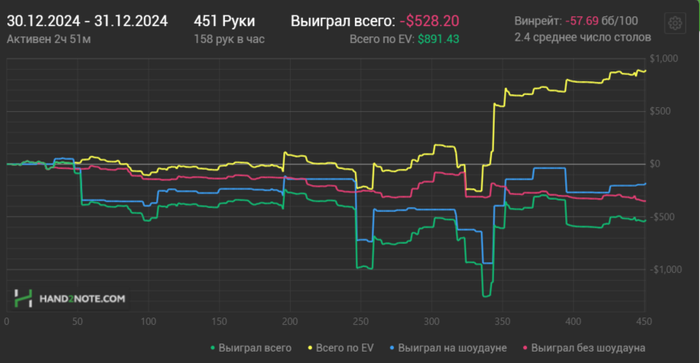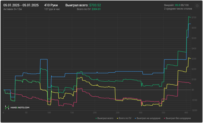 День 1, полет нормальный. Если бы еще не сыграть первые 70 рук, цены бы мне не было. Частая история. Подумал начинать сессию с лимита ниже, чтобы если в кого-то впаяться потому что не раскачался, было не так ощутимо.