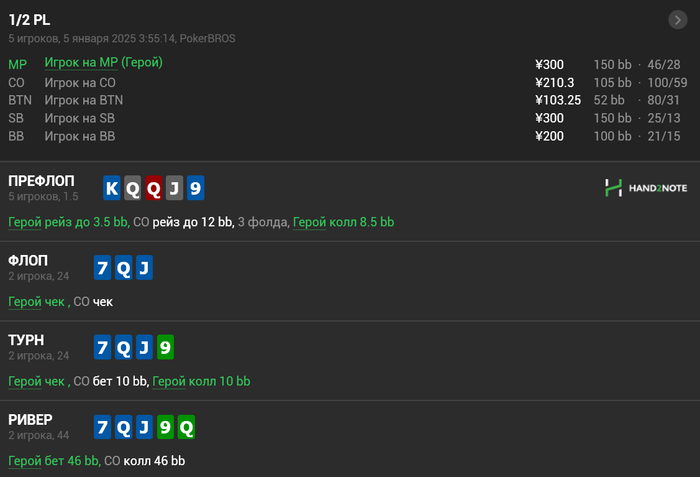 Сдача дня. Оппонент с 4бетом под 80 (4бет ренж 32), с велью в сайзах 1/2 и 1/1, с блефами в сайзах 1/3 и 3/4. ШД велью чекать умеет. Цбетит охотно, вскрывает вроде как тоже. Лид флопа не нашел из-за КК, которые не пришей везде рукав, выходим на терн. У меня уже на минуточку ТП+ОП+ОЕСД, но вроде как и ставить не могу, потому что карты по которым я доблефовываю закрывают дофига стритов, и падать не могу, потому что в кои веки хорошую сдали. Ривер закрывает два стрита.