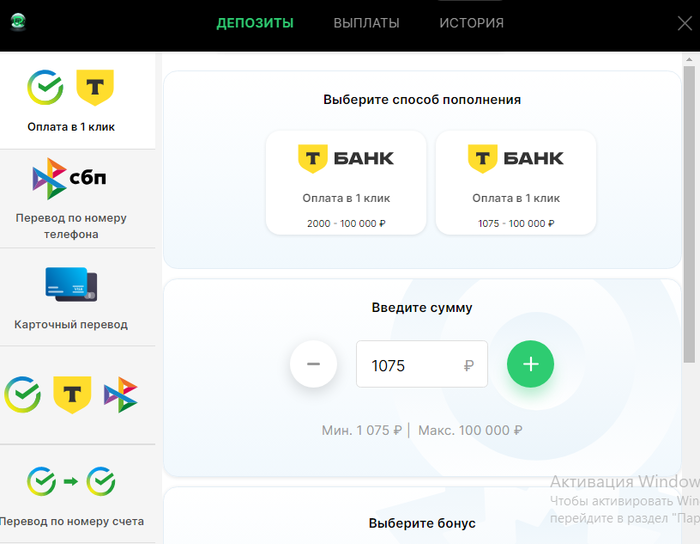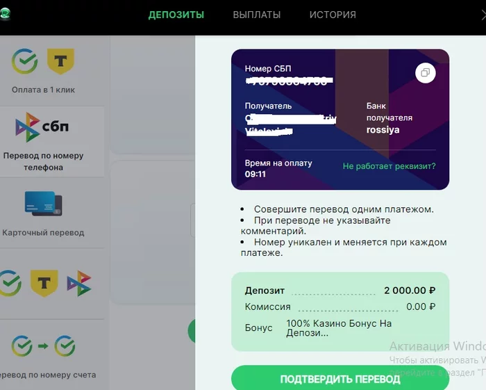 Перехожу в сбп перевод по номеру телефона нажимаю сделать депозит - появляется окошко