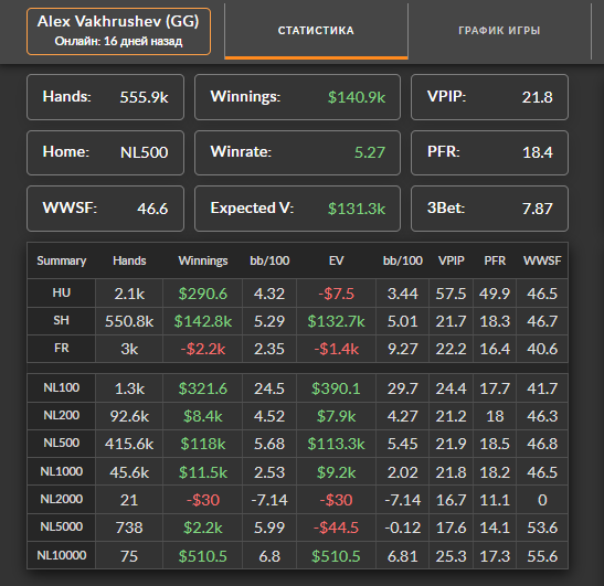 О себе: мне 27 лет. Играю профессионально в кэш с 22 лет. Прошел все лимиты от нл2 до нлк. Последние 4 года играю только на гг. Основной лимит нл500.