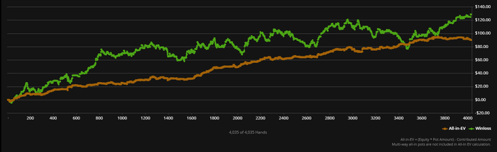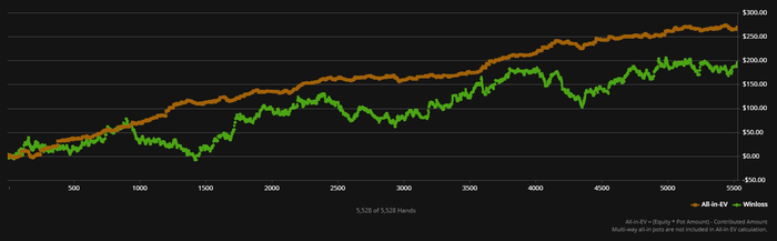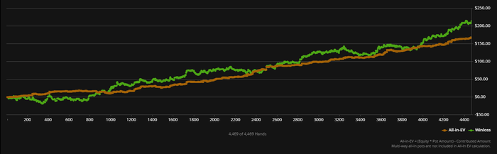 Оставил в кассе 200$ и сегодня сел катать первый день. Несколькими сессиями в сумме вышло 4000 рук и вот такой результат. Даже перебрал немного.