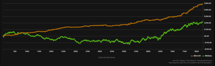Баланс на сегодня: 215.18$, из которых 45.08$ и 23.27$ выдали во Флипаутах. Не знаю бьётся ли 6+ вообще? По графику в PokerCraft EV болтается где-то около 0, а зелёная переапанная на данный момент. Флипауты конечно существенную часть к банкроллу дают. Попробуем, поиграем в течение месяца точно.