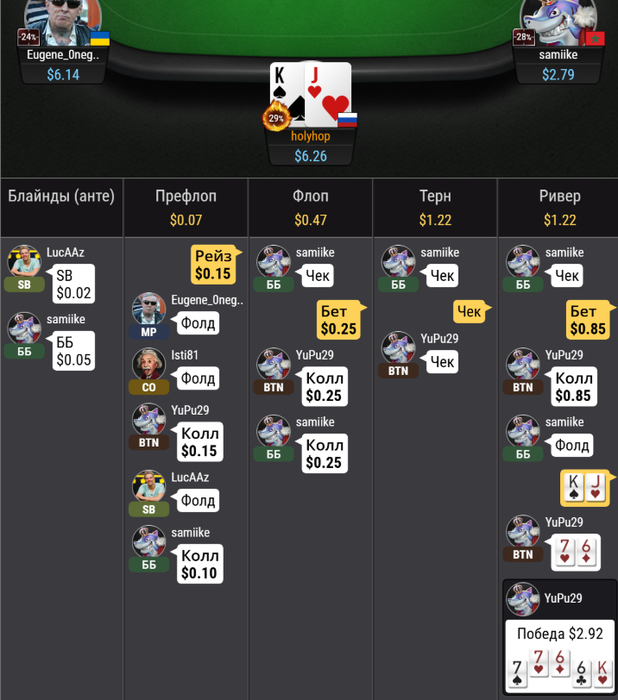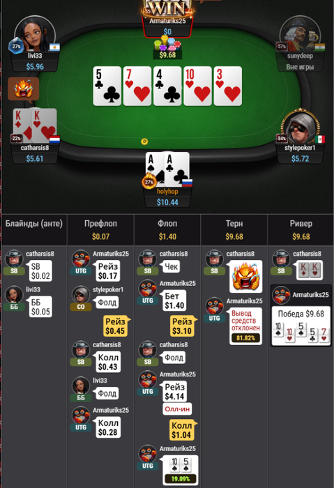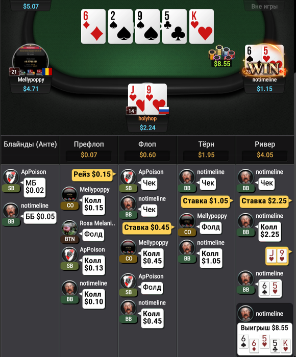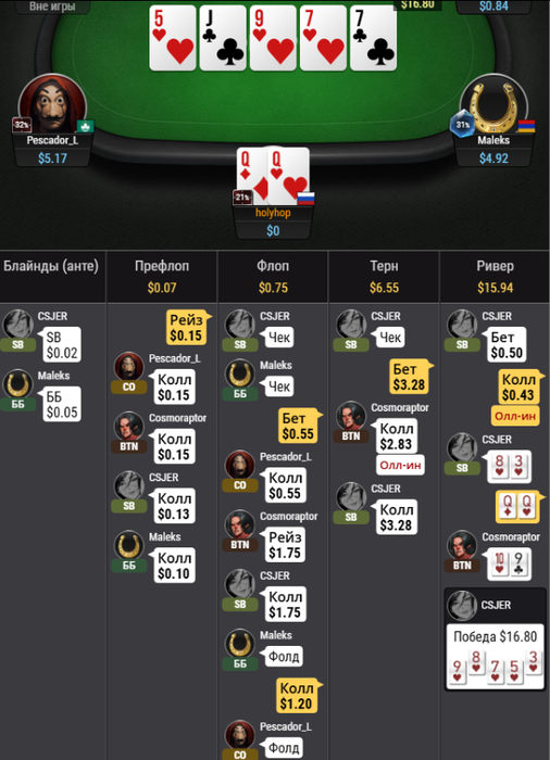 В закрывшийся на тёрне флеш и стрит ставить тоже смысла нет. Чекаем и пытаемся ривером кого-нибудь да переехать)