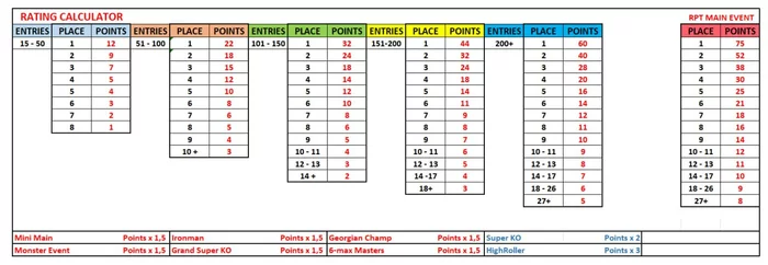 Размер начисляемых баллов зависит от общего количества участников в турнире и от его стоимости, поэтому, внизу таблицы указаны коэффициенты, которые будут применены к определённым событиям.