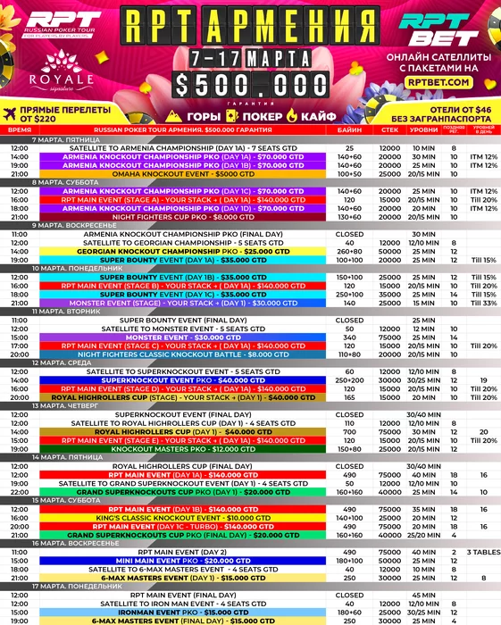 🔥 RPT вернется в Армению с большим этапом уже 7-17 марта, серия пройдет с гарантией $500,000 в Цахкадзоре, Royale Сasino! Поступает очень много вопросов от новичков и тех, кто летит в Армению впервые, поэтому мы вновь в одном посте собрали ответы на самые частые из них.