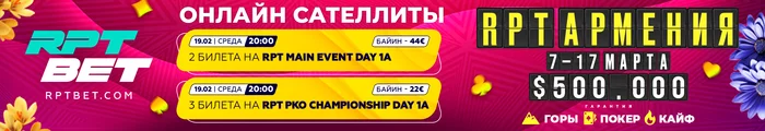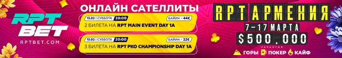 🏆🏆 Минимум ДВА БИЛЕТА в RPT Main Event, а также минимум ТРИ БИЛЕТА в Armenia PKO Championship: сегодня на RPTBET пройдут сразу два отличных онлайн-сателлита к этапу RPT 7-17 марта в Армении!