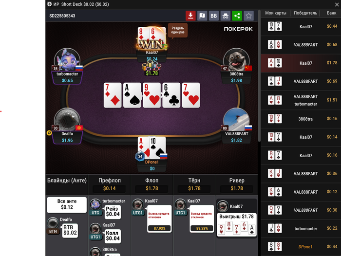 Вот на скрине Я выйграл с двумя парами. На столе все показано верно, но в истории стол поменялся. Вместо червовой семерки там стоит бубновая восмерка, которой на столе не было! Раздавали один раз.