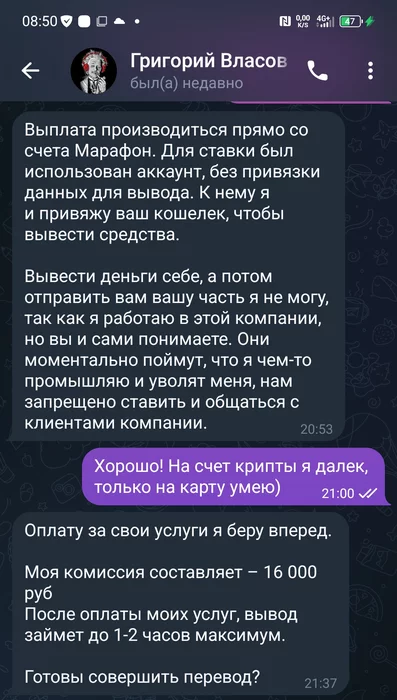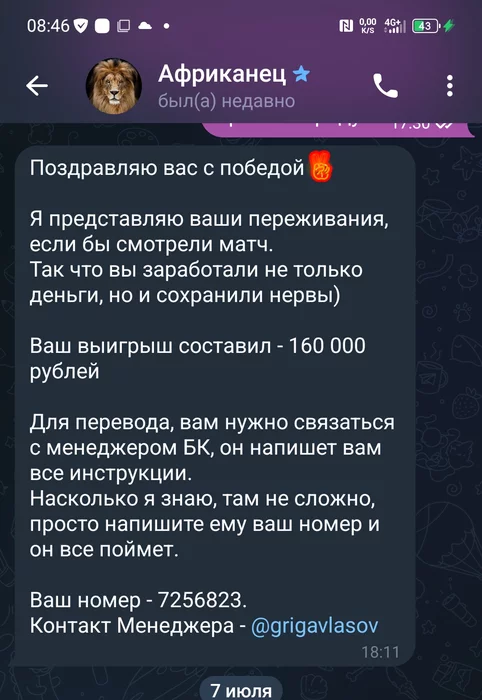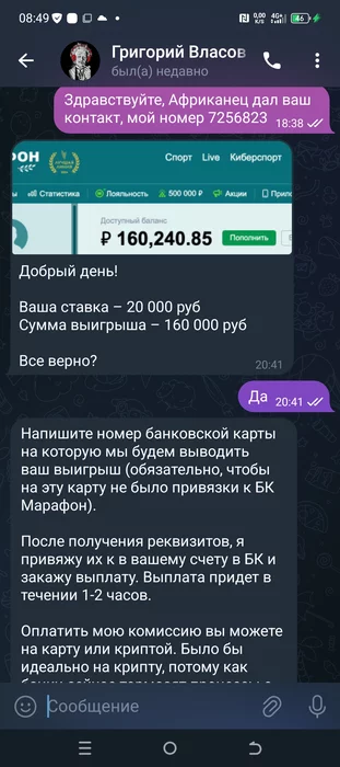 Joras008, Всем здоров, с.ка раньше не увидел вашу общуху, вчера зарядил Африканцу на ТС, в общем кидалово, как вы и писали. Якобы ставка сыграла на ТС, озвучил выигрыш, но надо вывести через менеджера, которому необходимо чехлануть 10% от выигрыша. Ну и соответственно после оплаты тишина. Первая ставка на кф2 сыграла легко, потом лично прислал предложение на ТС, ну и я окрыленный этим повелся, хорошо не много зарядил, 20000, он еще пишет почему так мало, мол типа все верочно. В итоге бабло прое.. но (