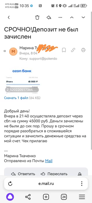 13.01.2025 сделала депозит на покердом 45000. Денежные средства до сих пор не зачислены. Пишу на сапорт, все молчат. Даже ответа, что обращение принято в работу нет. Подскажите, как решить данный вопрос?
