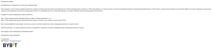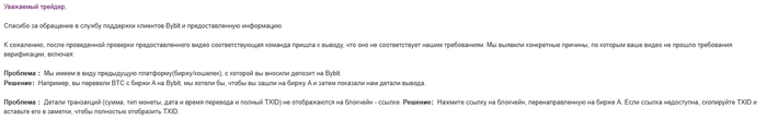 Пока ты не предоставишь саппорту Bybit чёткое подтверждение происхождения средств тебе деньги не разблокируют. А сделать это ты по всей видимости не можешь потому, что доступа к прошлой бирже уже нет.