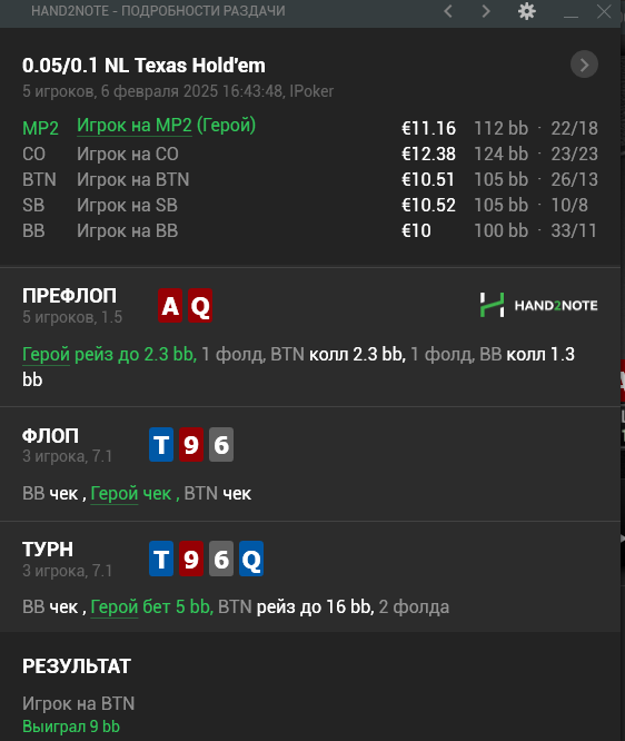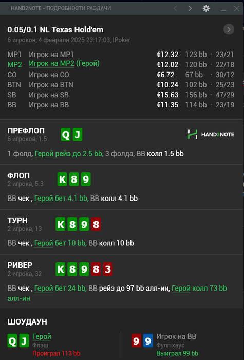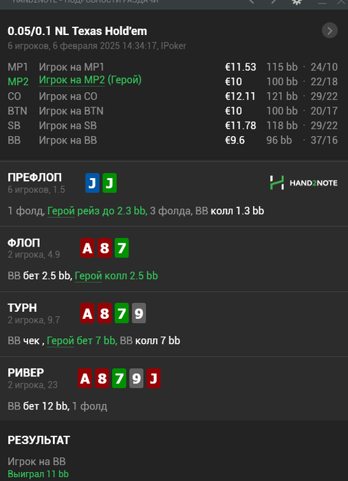 так же и на других позах. На BTN против сайза в 2bb нужно защищать пол колоды вряд-ли много игроков моих лимитов этим занимаются.