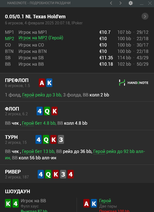 для моей руки это уже победа. АА КК чаще просто запушат.и я легко выкину вложив не много но избежав куча сложностей на постфлопе.