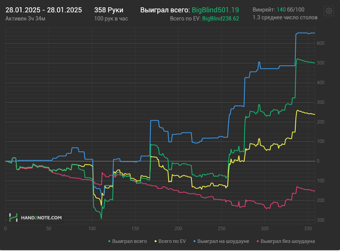 Сразу видно,когда не занимаюсь и не повторяю регулярно даже такие базовые вещи как сбеты и беты в мисс и результат проседает,когда активно занимаюсь ниже 85 он опускается редко. По планам на завтра:1) 250 рук защита бб против бтн,250 рук колд колы бтн со. 2)разминка сбеты доска д87,беты в мисс доска дв2 та которая сегодня плохо получилась. 3)тренировка в конфе фонда. 4)разбор доски ks9c5h4s которую не разобрал сегодня. 5)постараться наиграть 600+ рук,а то кол-во игры слишком маленькое у меня