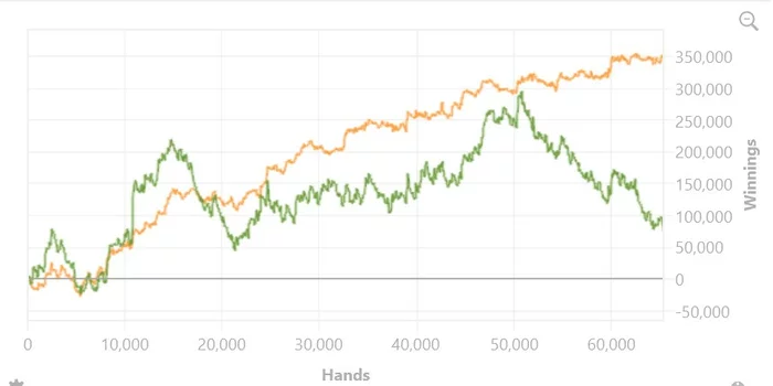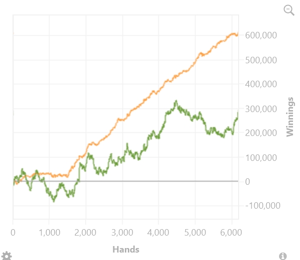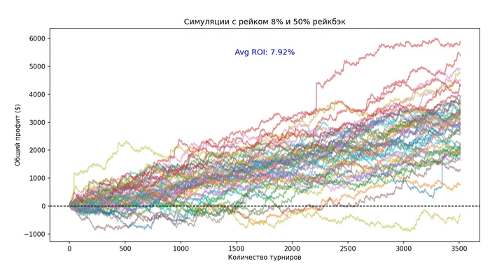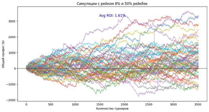 Сделал симуляции по фактическим моим показателям за 3150 турниров на 10ках: