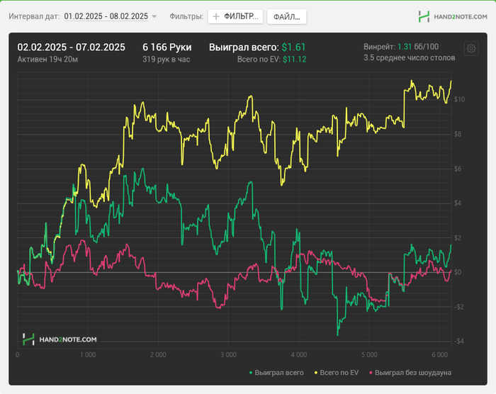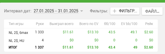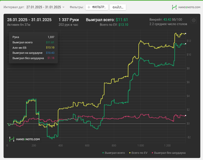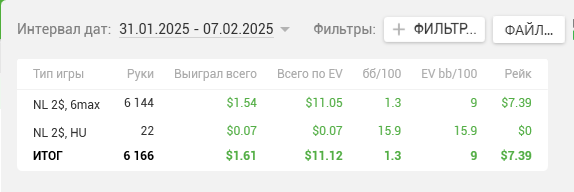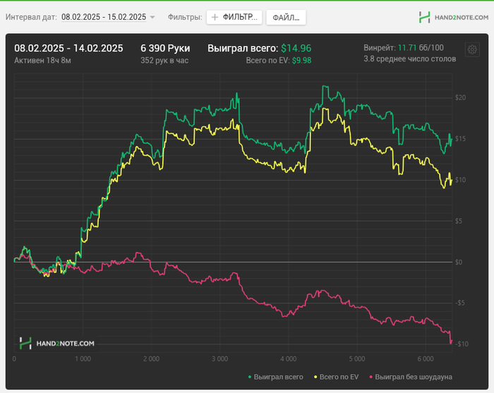Удавалось играть 4 стола по 2 сессии около 1.5 часов каждый день, сегодня сыграл даже три. Неделя прошла со стабильным недобором, понедельник был +$12, а дальше планомерно недодача забирала профит. Но в целом это совершенно неважно. Главное что я каждый день смотрел одно обучающее видео, играл по 1000+ раздач и в целом доволен собой полностью. Ошибки конечно же были, но и выводы из них стараюсь делать и совершенствовать игру. Удивительно, но впервые в жизни у меня получается стабильно играть с красной линией в нуле, все-таки МТТ навыки по атаке слабых линий пригодились и этому не приходится учиться с нуля, а только корректировать под реалии кэша. Поле невероятно слабое, поэтому гордиться положительным результатом нет смысла.