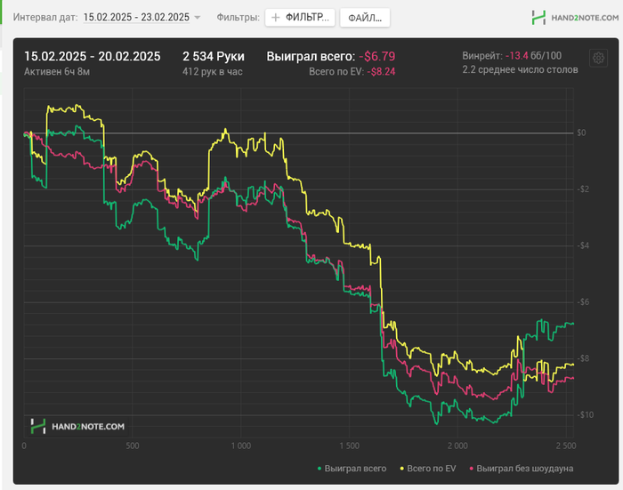 В целом пока на свою покерную карьеру смотрю с пессимизмом, но знаю что как только чуть выдохну - желание играть и улучшать игру вернется, ну а пока буду стараться выполнять хотя бы задачи минимум. Всем удачи кто читает, желаю играть и учиться больше и лучше меня)