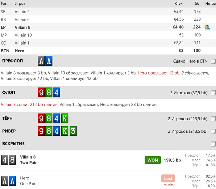 Итого: пассивная линия с префлопа пивела к куче ненужных и сложных решений на последующих улицах в которой легко еще больше допустить ошибок. В префлопе сила брат)😀