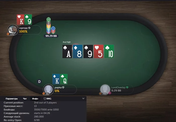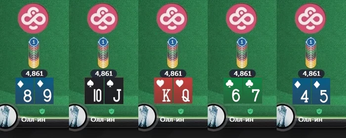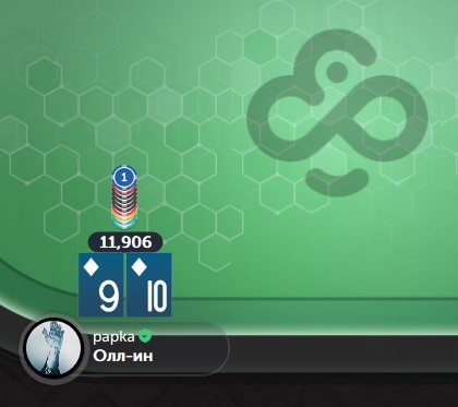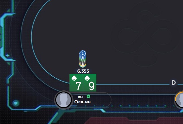 Немного остыв и успокоив себя мыслями о том, что, в этой игре, всякое бывает, и впереди ещё куча отличных возможностей очень далеко подняться по карьерной лестнице — ты, глубоко вздохнув, запускаешь следующий Чемпионский "турик". И, спустя время, делаешь, как оказалось, поистине отличный "колл" моментального оллына от игрока, находящегося на позиции малого блаинда — ещё до того момента, как дилер начал открывать карты на столе...