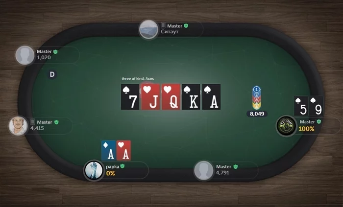 (конкретно тут, поймав "сет" семëрок, ты, допустим, шедеврально вынудил оппонента загрузить все фишки в блеф ещё на флопе)