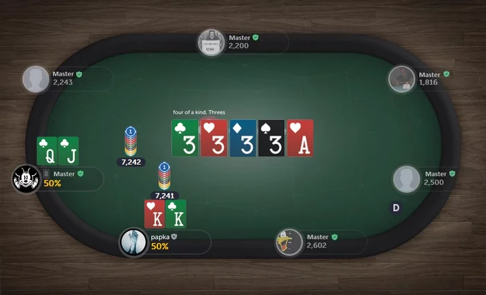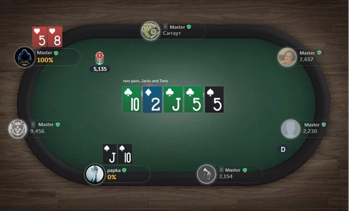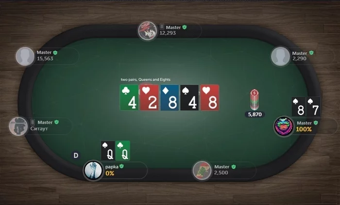 Очевидно, оппоненту очень повезло поймать одну из двух этих самых шестёрок. С целью немного поднять себе настроение, ты решаешь, хотя бы, попробовать угадать масть той фатальной "картонки" и, чтобы хоть где-то точно выиграть, мысленно ставишь одинаковые суммы на каждый из двух возможных, по твоему мнению, вариантов — после чего, заметно повеселев, открываешь историю раздач и, ехидно улыбнувшись, понимаешь, что ещё и тут ты уже в приличном минусе...