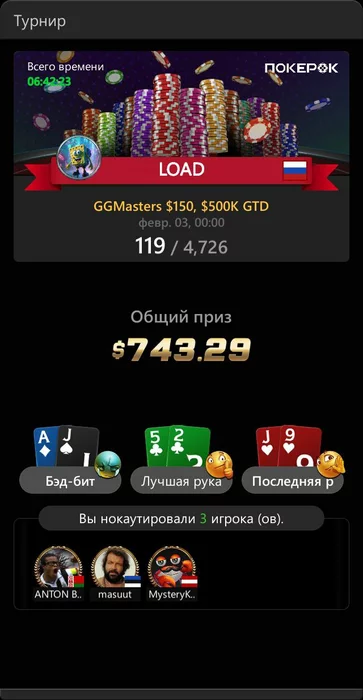 Этот пример касался турнира GG MASTERS, где вход один, без реентри, и это меня ещё больше мотивировало выиграть этот проход. В итоге я потратил около 35$ (играл только на 1.5$), а результат — чуть больше 700$. Отличный профит, согласитесь!