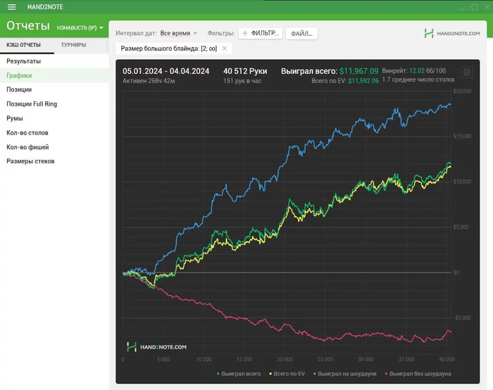 Общий профит игрока за всю дистанцию – $17.5к, но при этом большой мейк в 10.6к в начале дистанции из-за которого мы как бэккеры в минусе.