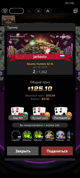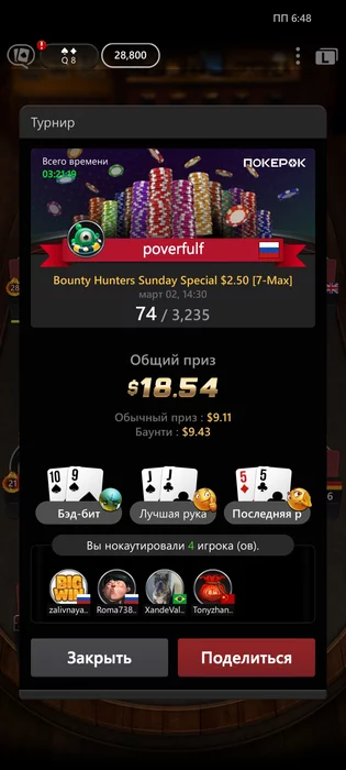 Приложу пару скринов своих турниров, а точнее результатов в них.