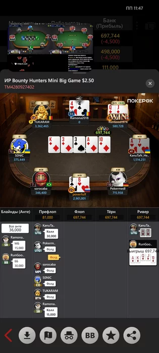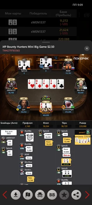 В этот турнире игра складывалась спокойно без экшена возможно благодаря этому я и добрался до финального стола и оказался в топ2. Так не было лютой дичи со стороны оппонентов за столами и турнир сложился спокойно. Правдо было пару монеток где закрывал с низы но выставления были в таком процентном соотношении 60/40 или 65/35 так скажем ехал достаточно с хорошими шансами.