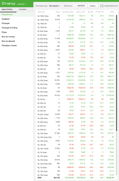 И продолжалось бы возможно до сих пор, если не череда событий в мире, которая заставила переосмыслить всю свою жизнь. Вот так выглядят результаты из моей последней базы, которая до сих пор хранится на рабочем компьютере, как воспоминание о покерном пути. За всё время было отыграно порядка 3 миллионов раздач, с примерно аналогичным винрейтом.