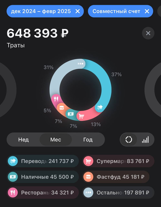 Скорее всего будет больше, так как и у меня, и у супруги кроме совместного счёта есть другие, которые тоже тратятся. Но тут - основное.