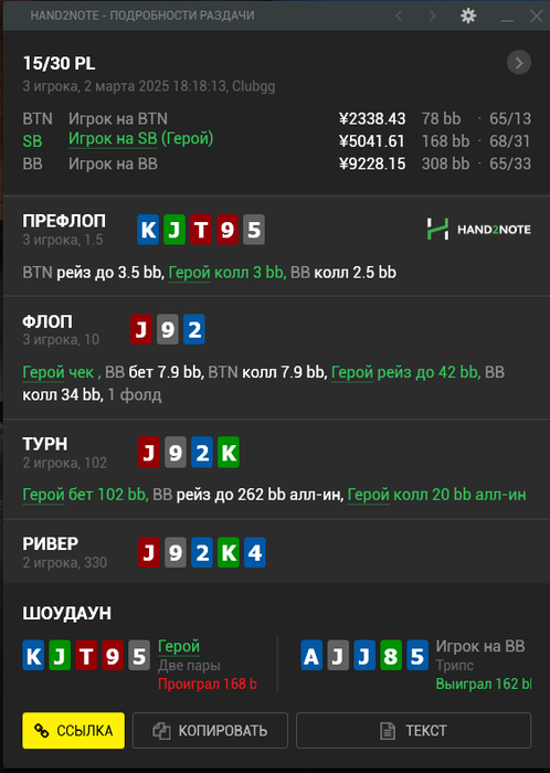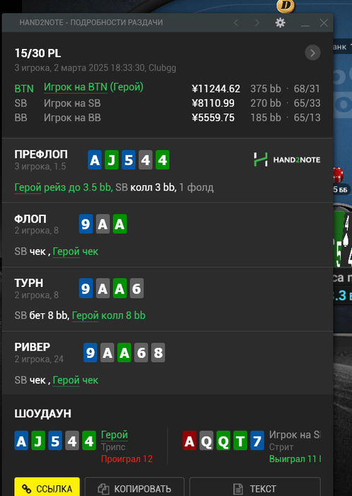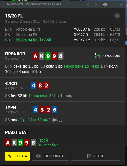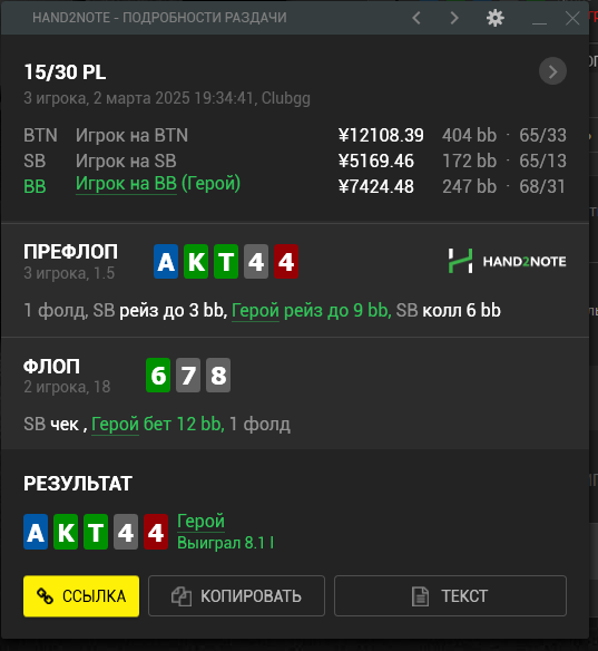 GlamurDim, Благодарю за исчерпывающие факты, я все понимаю когда читаю разбор, и в момент раздачи тоже понимал, что выхожу за рамки, но еще играет это типа перебить слабых оппонентов(работаю над этим)