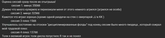 в общем сегодня получил пиздюлей , надеюсь в рамках дисперсии без моих косяков. По ощущению все шло очень тяжело , психологически напряжённые сессии и раздачки с не простыми решениями . в третей сессии пришлось сделать дистанционный разрыв. Думаю что ошибок допустил немного , короче надеюсь минус не по моей вине. Посмотрю в понедельник , завтра выходной.