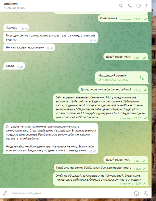 Игрок решил прекратить сотрудничество в одностороннем порядке, присвоив все денежные средства себе. Сумма доли беккера после последнего расчета 2235. Не выходит на связь