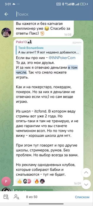 Также у Романа есть канал в телеге где происходит общение между игроками , а Роман со своей командой освещают акции от румов и агитируют играть под их партнеркой. Для игры в приложениях Роман рекламирует аффилейт INNpoker . По его словам за них он отвечает деньгами.